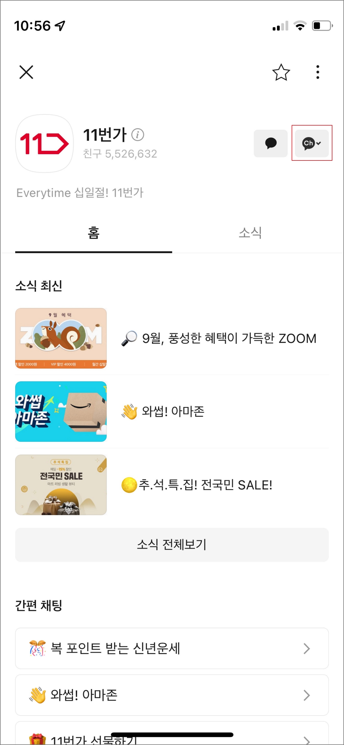 1. 먼저 차단하고 싶은 채널을 눌러 채팅 화면으로 들어갑니다. 저는 11번가를 택했습니다.