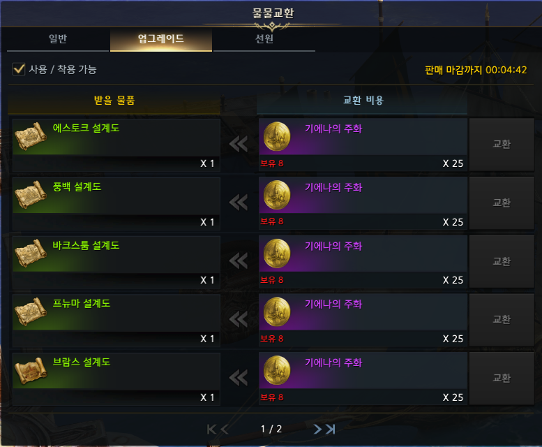 설계도는 텀벙게 어업 길드선 업그레이드 메뉴에서 기에나의 주화 25개로 교환할 수 있습니다. 기에나의 주화가 없다면 창고에 자고 있는 항해 주화 선택 상자에서 사용하시면 되겠습니다.