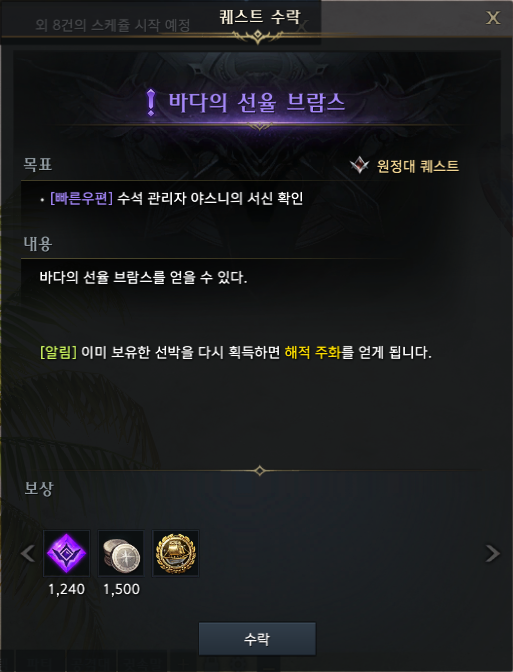 퀘스트 시작 아이템을 클릭해 바다의 선율 브람스 퀘스트를 받고 완료하면 브람스를 얻을 수 있습니다.
