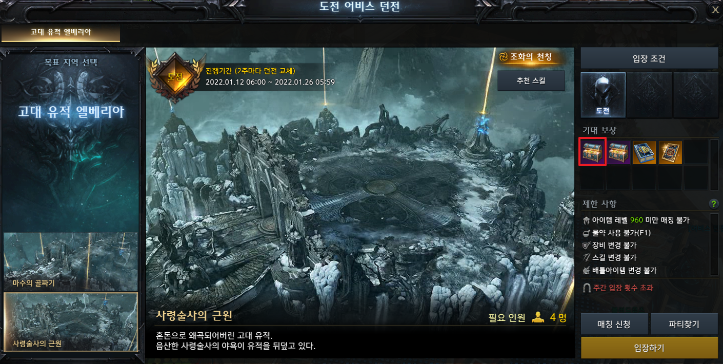 혈마석 교환 NPC 위에 있는 혼돈의 사선 던전에 입장 후 클리어하면 혈마석을 얻을 수 있습니다. 노말은 1370, 하드는 1415부터 입장 가능합니다.