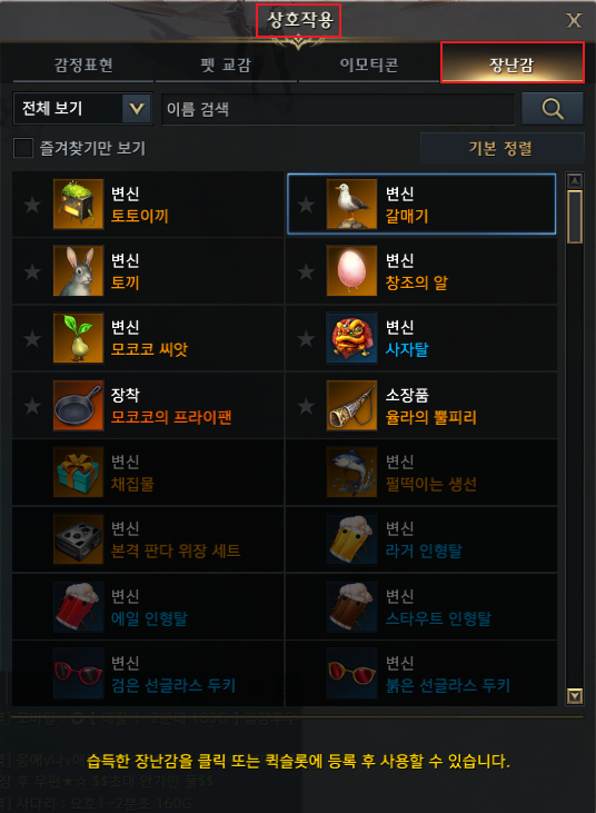 얼마 전 패치로 인해 커뮤니티 > 상호작용 메뉴에 장난감 탭이 생겼습니다. 이미 등록한 장난감은 여기서 확인 가능하고 장난감 획득 후 사용하면 자동 등록됩니다. 퀵슬롯에 등록한 후 사용 가능합니다. 바뀌었는지 모르고 한참 찾았네요. 인벤토리 차지하지 않아서 좋은 것 같습니다.