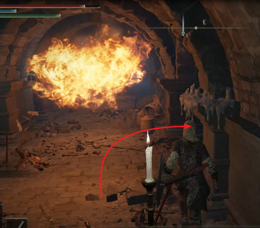 내려가서 몹 2마리(생각보다 쌤)를 잡고 앞으로 직진합니다. 터널 같은 곳에서 잠시 멈추세요. 앞에 보이는 원 기둥에서 불을 뿜습니다. 기다렸다가 불이 멈추면 직진 후 우측 공간으로 피해 주세요. 몹 한 마리 있으니 처치해줍니다. 불이 사라지면 다시 직진합니다. 기둥을 한 대 때리면 불을 멈추게 할 수 있습니다.