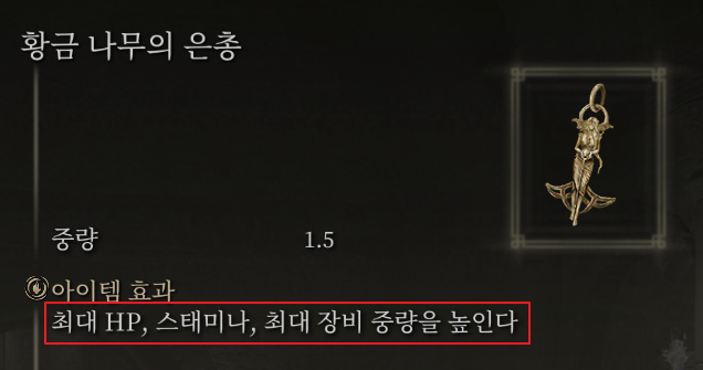 아이템 효과를 보시면 최대 HP, 스태미나, 최대 장비 중량을 높여준다고 하니 굉장히 유용한 탈리스만입니다. 초중반에 게임 진행하는데 많은 도움이 됩니다.