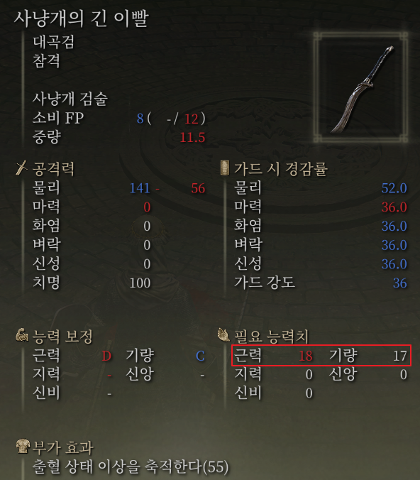 전투 기술은 사냥개 검술이고 근력 18, 기량 17이 필요합니다.