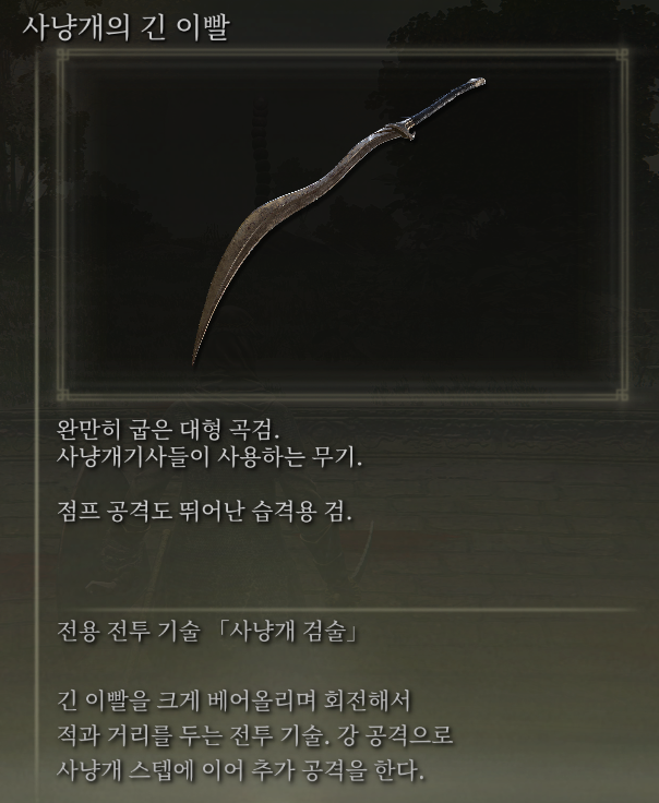 이번 포스팅은 룩이 멋있는 대곡검 사냥개의 긴 이빨 얻는 방법입니다. 스트리머나 유튜버들도 초반에 많이 쓰고 있는 검입니다.