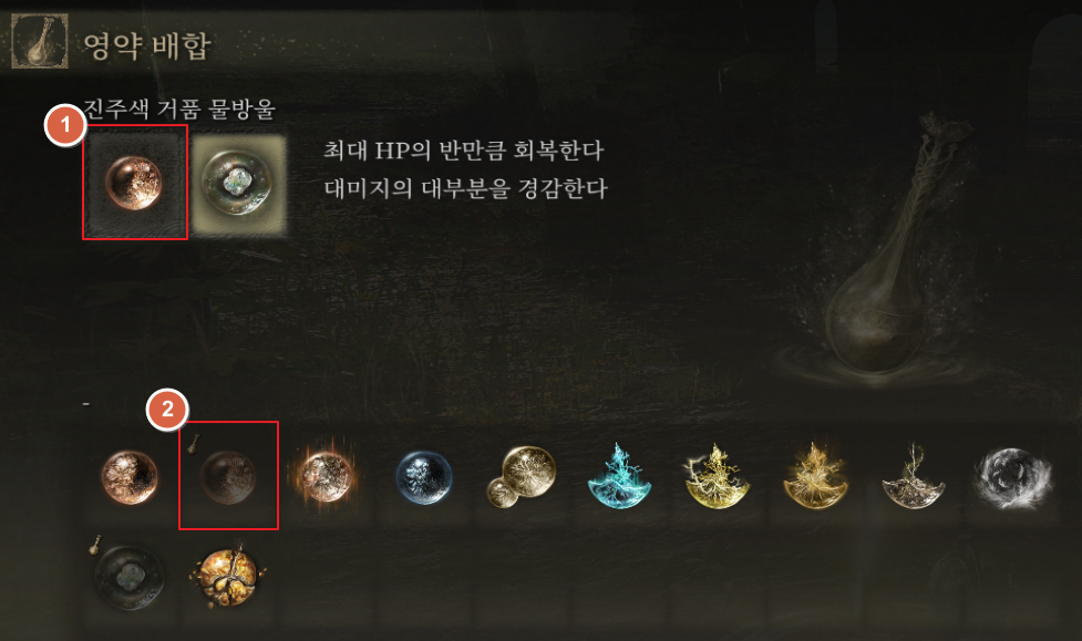 이번 포스팅은 보조 물약인 영약 사용하는 방법입니다. 엘든링은 체력, 마력을 올려주는 붉은, 푸른 물방울의 성배병과 보조 물약 개념인 영약의 성배병이 있습니다. 영약의 성배병이 있어야 물방울을 배합해서 사용할 수 있습니다.