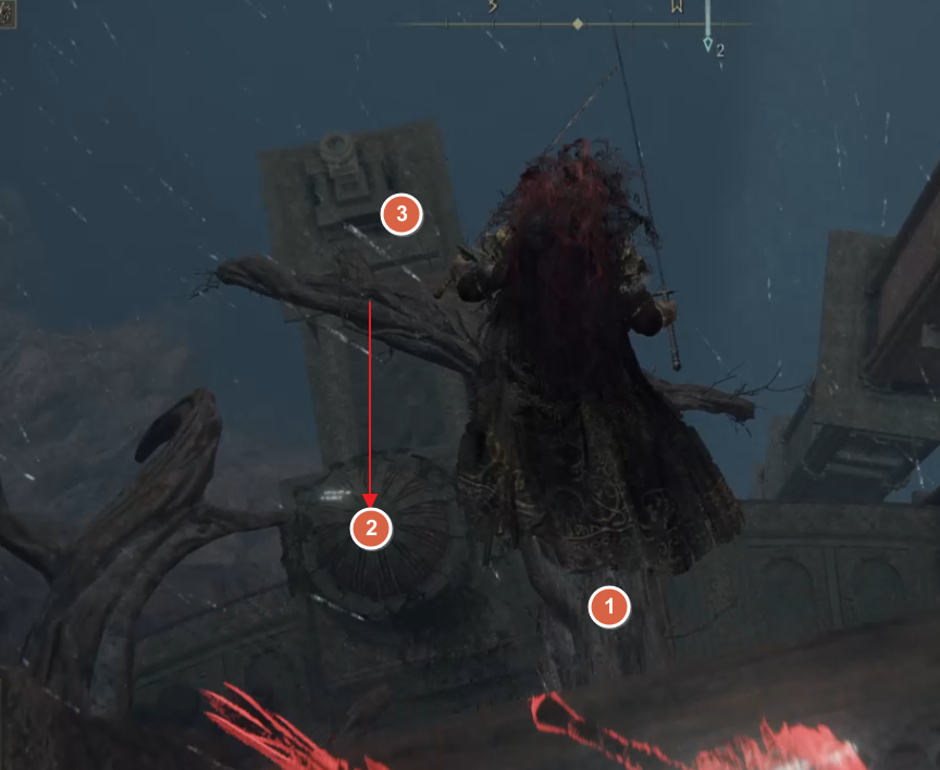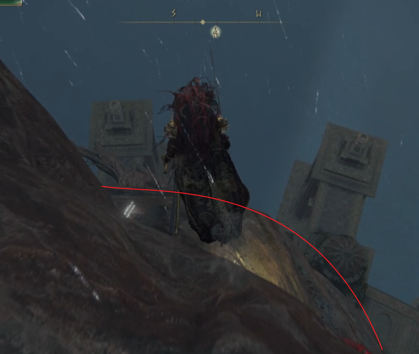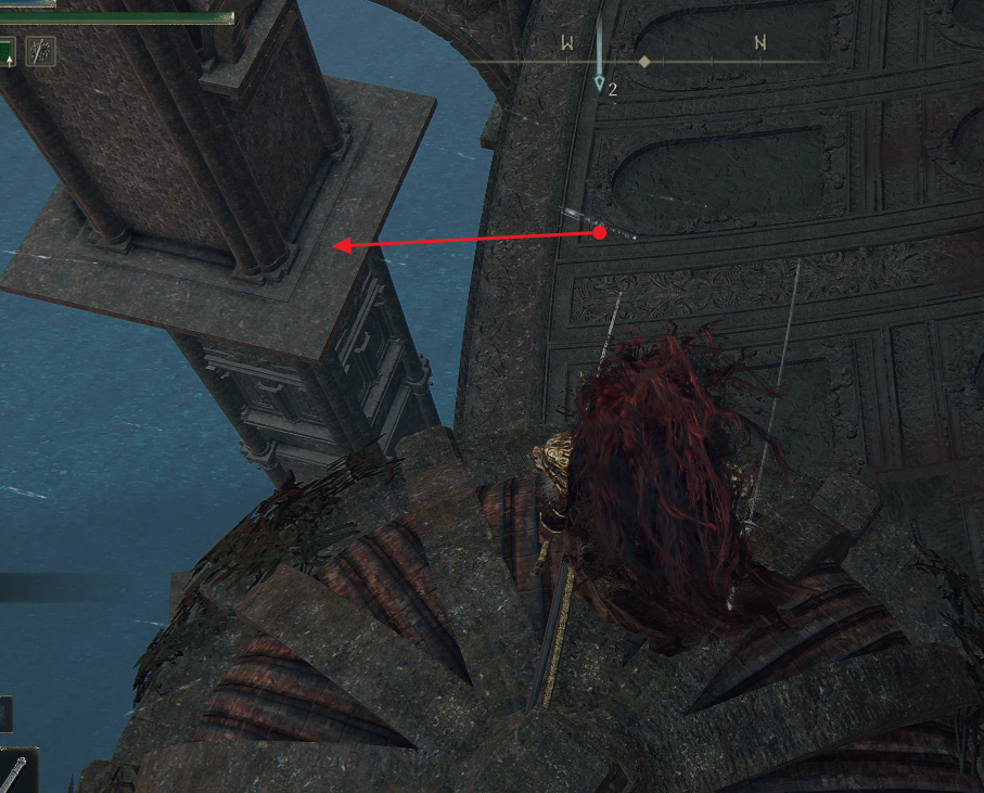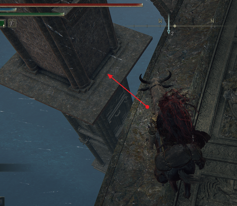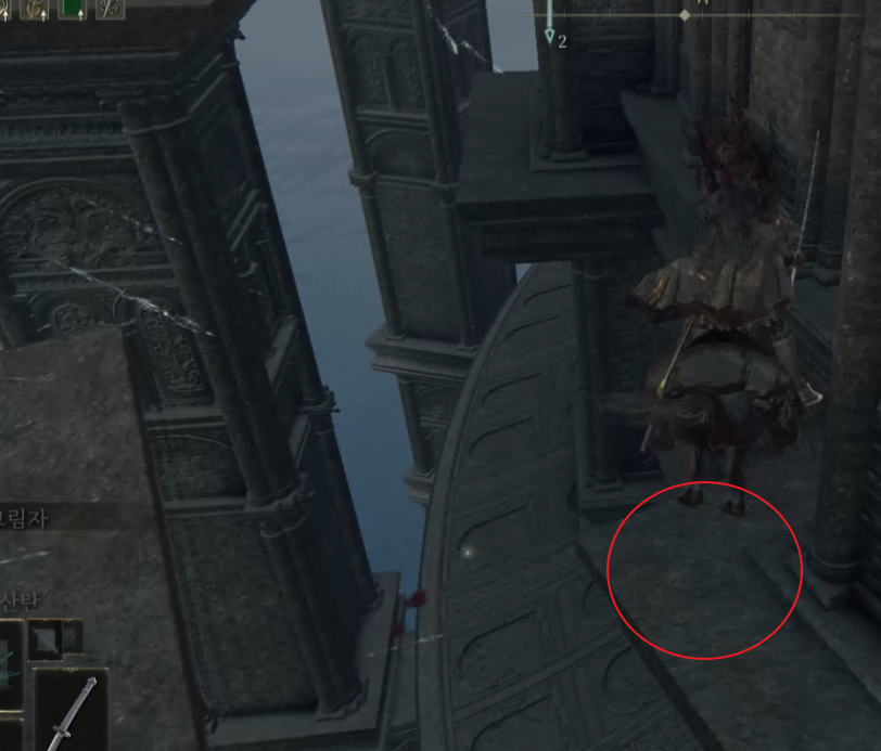 여기서부터는 말을 타고 2단 점프를 해야 합니다. 반대 방향에 있는 기둥 난간으로 점프하세요.