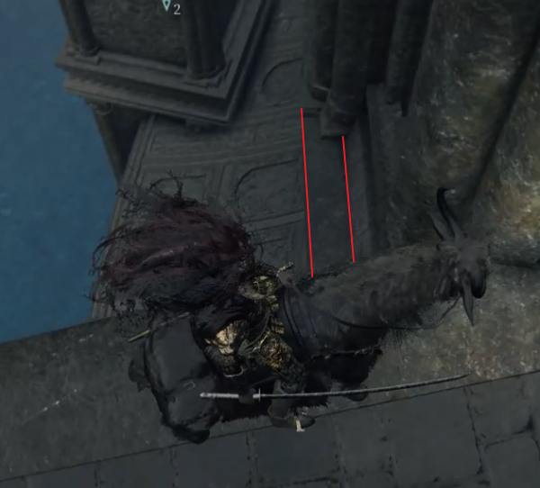 다시 반대편 난간으로 점프 후 우측 기둥에 튀어나온 부분으로 점프해야 합니다. 바로 내려가면 낙사당합니다.