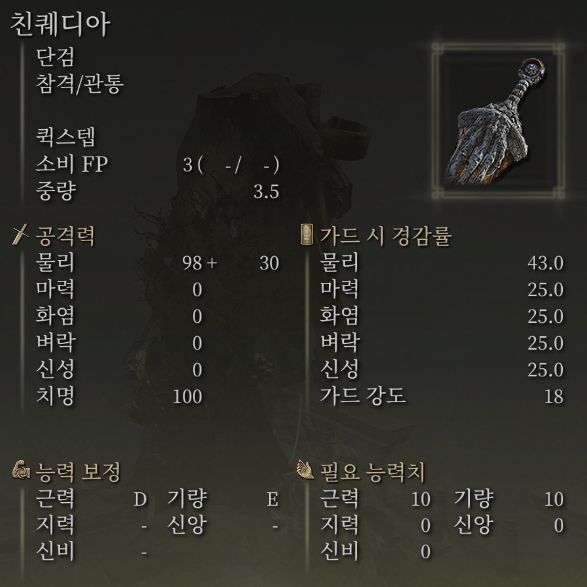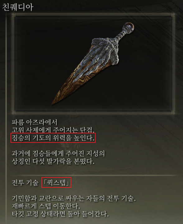 단검으로 퀵스텝이 붙어있습니다. 근력 10, 기량 10으로 비교적 낮은 능력치를 필요로 하네요. 짐승의 기도의 위력을 높여주는 부가 효과가 있습니다. 기도 빌드하는 분들에게 괜찮을 것 같네요.