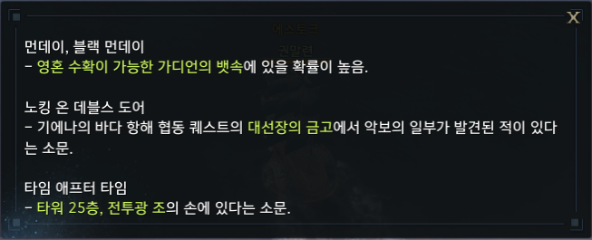 완료하면 보상으로 섬의 마음뿐만 아니라 항해 주화, 각인서 선택 상자도 얻을 수 있습니다. 먼데이, 블랙 먼데이, 노킹 온 데블스 도어, 타임 애프터 타임 3가지 미션을 완료해야 하는데요. 자 그럼 어떻게 해야 하는지 하나씩 살펴보겠습니다.