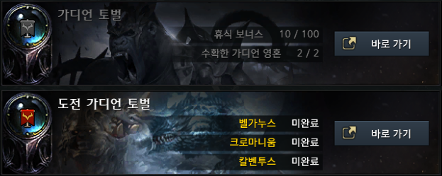 힌트에서 알 수 있듯이 가디언 토벌이나 도전 가디언 토벌을 하게 되면 완료할 수 있습니다. 단, 영혼 수확이 가능한 상태여야 완료가 되며 영혼 수확을 이미 한 상태에서 가디언 토벌을 했을 때는 완료되지 않습니다.