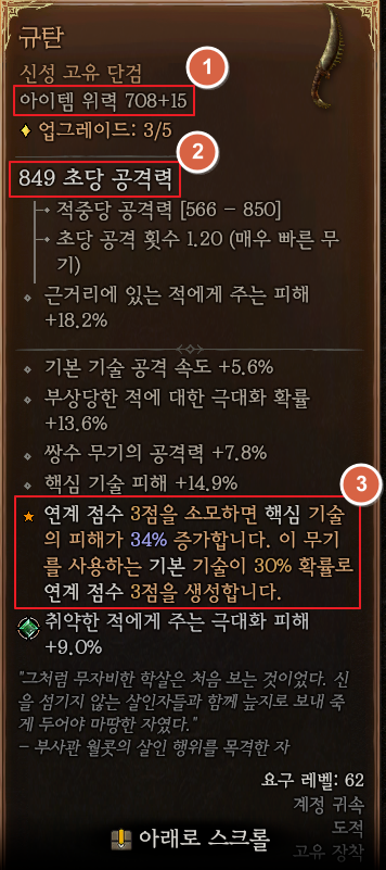 보통 아이템을 업그레이드하면 1 업그레이드 당 위력 5가 추가되며, 세부 옵션이 10% 증가하는 것을 볼 수 있습니다. 원거리에 있는 적에게 주는 피해가 28%에서 10%인 2.8%가 추가되어 30.8% 된 것을 확인할 수 있습니다. 아이템 위력 상승 구간과 상관없는 장비입니다.