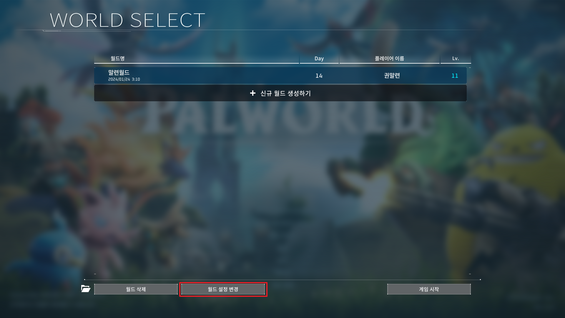 이미 월드를 생성하신 분들은 월드 설정 변경 버튼을 클릭합니다.