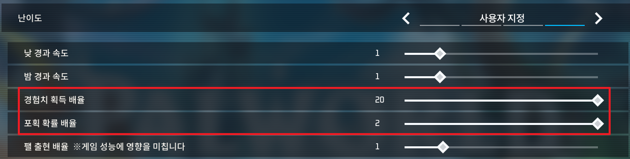 저 같은 경우 빠르게 레벨업을 하고 싶어서 경험치 획득 배율과 포획 확률을 늘렸습니다.
