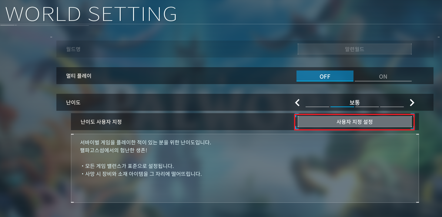 팔월드 2일 차 난이도 보통으로 하고 있는데요. 솔플로 하다 보니까 좀 더 수월하게 진행하고자 난이도를 사용자 지정으로 한번 변경해 보겠습니다. 난이도는 게임사에서 최적으로 맞춰 제공하고 있기 때문에 극단적으로 변경하면 재미가 반감이 될 수 있으므로 적당한 선에서 조절하는 것이 좋겠습니다.