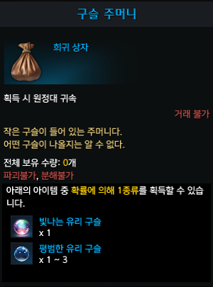 빛나는 유리 구슬은 에포나의뢰 NPC인 칼레에게 구슬 주머니 구매 후 사용하면 랜덤으로 빛나는 유리 구슬 및 평범한 유리 구슬을 얻을 수 있습니다. 평범한 유리 구슬 10개로 빛나는 유리 구슬 1개 제작 가능하고 운이 좋다면 빛나는 유리 구슬을 바로 얻을 수 있습니다.