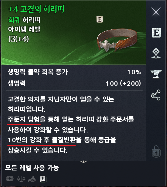 다른 방어구와는 다르게 허리띠는 고결의 허리띠 1개로 정해져있습니다. 이 허리띠를 10강까지 강화하고 물질변환을 통해 다음단계로 업그레이드하는 시스템입니다.