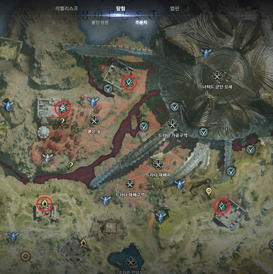 맵에 표시된 모닥불 모양의 아이콘이 주둔지입니다. 주둔지에 들어가 퀘스트를 완료하면 고결의 허리띠 강화 주문서를 얻을 수 있습니다.