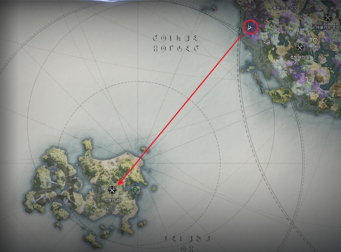 지역 서브 퀘스트나 주신의 흔적을 모으기 위해 영원의 섬에 가야하는 일이 생깁니다. 지도상으로 보면 7시 방향에 외딴 섬인데요. 비행으로 가기에는 너무 멀어보입니다. 바람길로 한방에 갈 수 있는 시작 지점 알려드립니다.