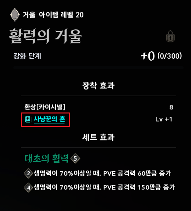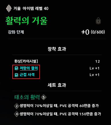 | 2세트 | 생명력이 70% 이상일 때, PVE 공격력 60만큼 증가 |