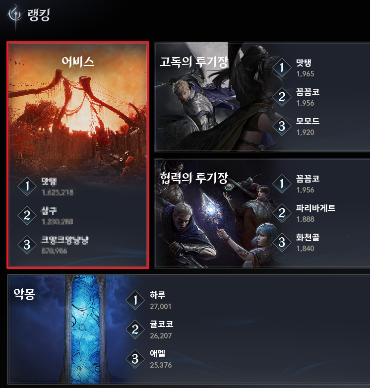 2. 랭킹 화면에서 어비스를 선택합니다.