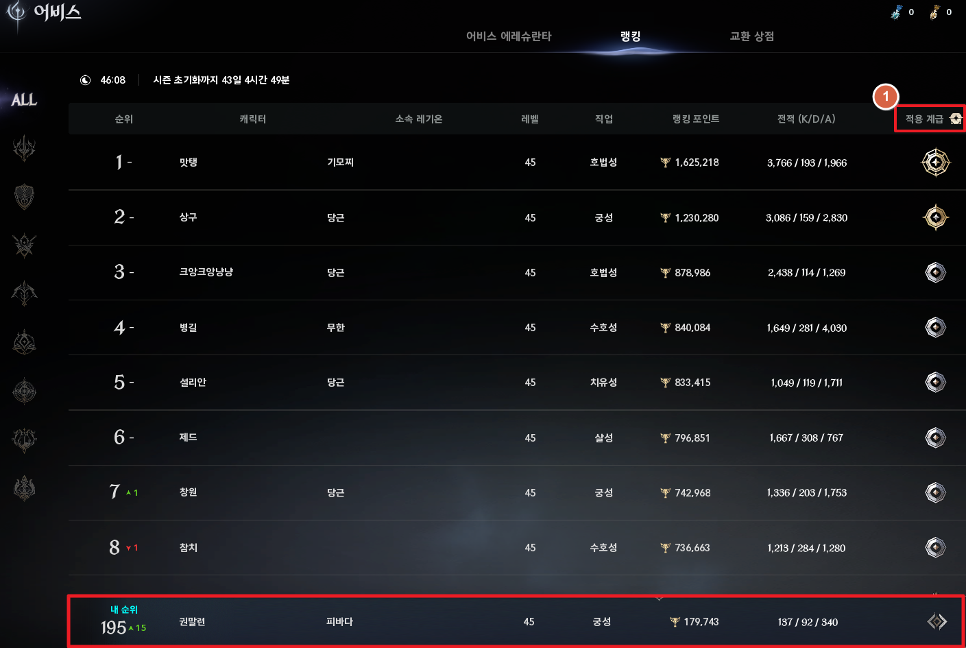 가장 하단에 보면 내 케릭터의 순위와 랭킹 포인트를 확인할 수 있습니다. 킬데쓰와 적용 계급 아이콘도 확인할 수 있어요.