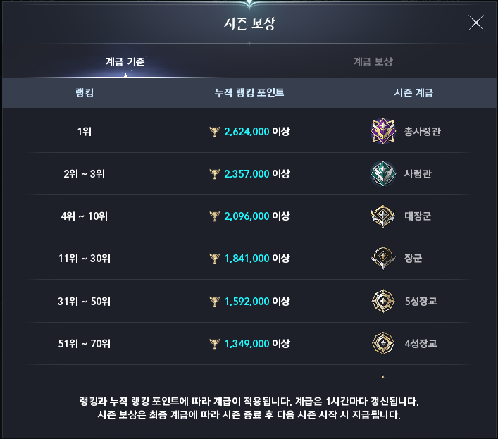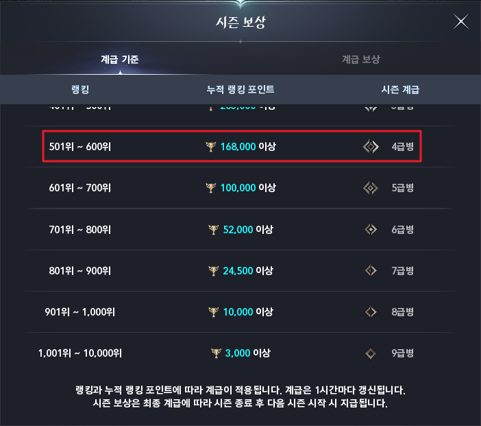 그럼 시즌 보상화면이 보이는데요. 누적 랭킹 포인트에 따라 시즌 계급을 확인할 수 있습니다.