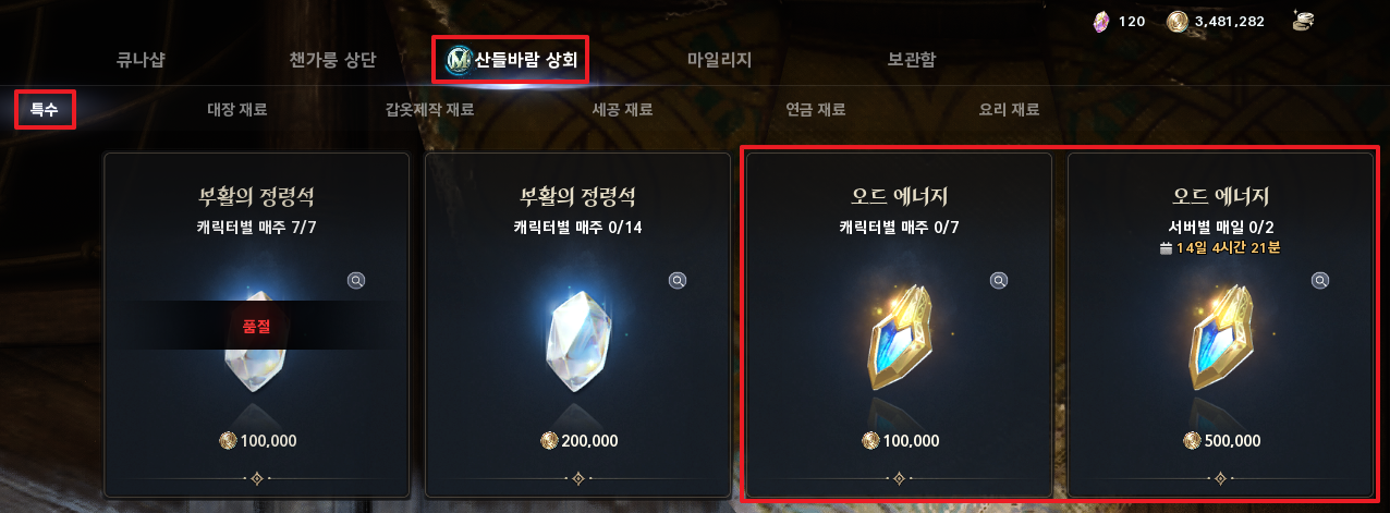상점 > 산들바람 상회 > 특수 메뉴에서 서버별로 매일 2개, 일주일에 7개씩 구매할 수 있습니다. (오드에너지 40)