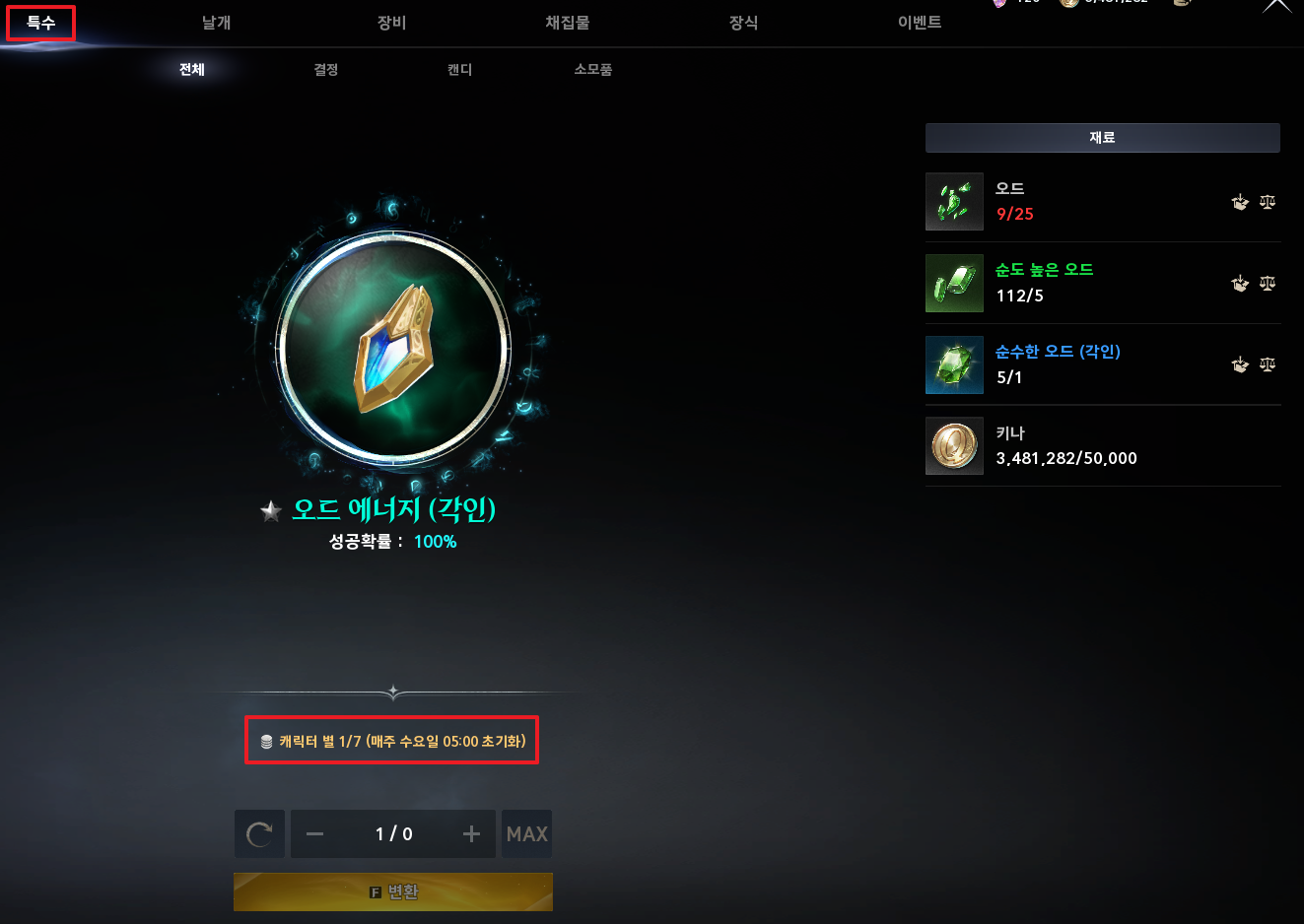 물질변환 > 특수 메뉴에서 오드와 키나로 일주일에 7개씩 제작할 수 있습니다. (오드에너지 40)