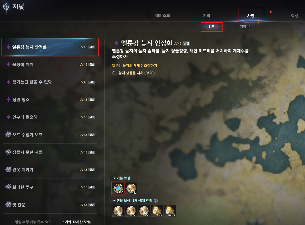 저널 (J) > 사명 > 임무에서 하루 5개의 퀘스트를 진행할 수 있습니다. 좌측에 있는 임무 목록에서 5개를 선택하여 수행합니다.