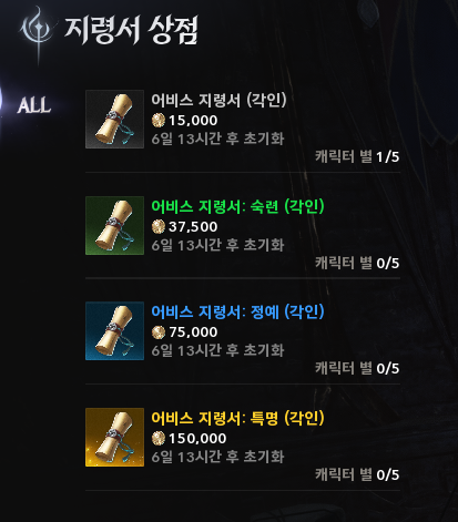 사명 지령서 퀘스트와 마찬가지로 어비스에서도 어비스 지령서를 구매할 수 있습니다. 종류별로 각각 1주에 5개씩 구매하여 기본보상 500에 랜덤 보상으로 추가적으로 얻을 수 있습니다.