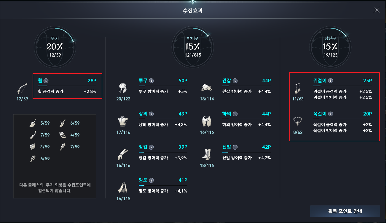 옷장 메뉴 좌측 상단 아이콘을 클릭하면 그 동안 수집한 외형 장비의 갯수에 따라서 능력치 증가 효과를 확인할 수 있습니다. 궁성인 저는 활과 귀걸이, 목걸이에서 새로운 외형 장비를 얻을 수록 능력치가 올라갑니다.