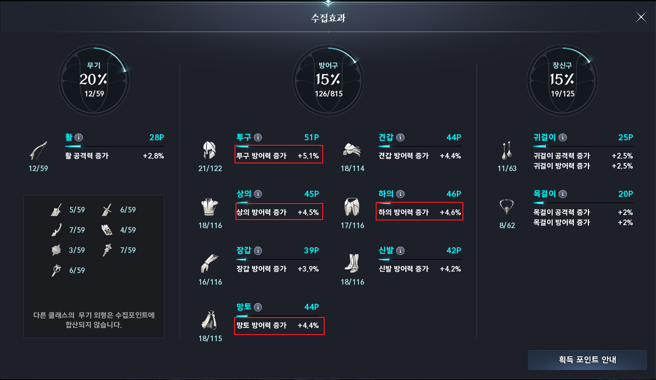 전과 비교를 해보면 새롭게 얻은 투구, 상의, 하의, 망토에서 약간의 수치가 증가된 것을 확인할 수 있습니다.