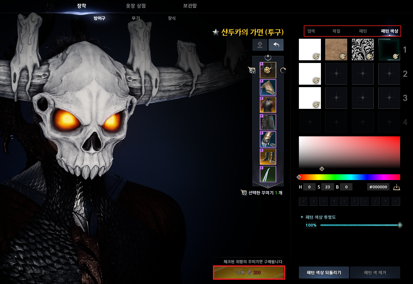 3. 꾸미기가 완료되면 구매 버튼을 클릭하여 적용할 수 있습니다. 한 부위당 200 큐나가 들어갑니다.