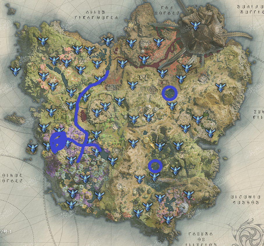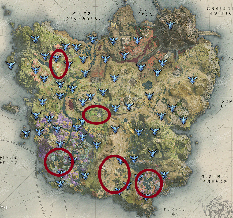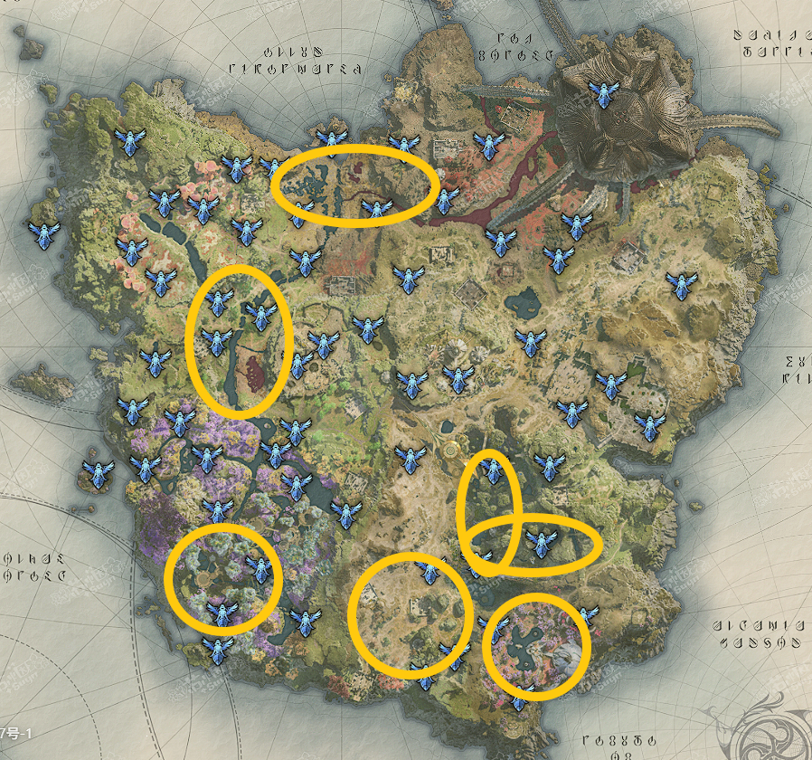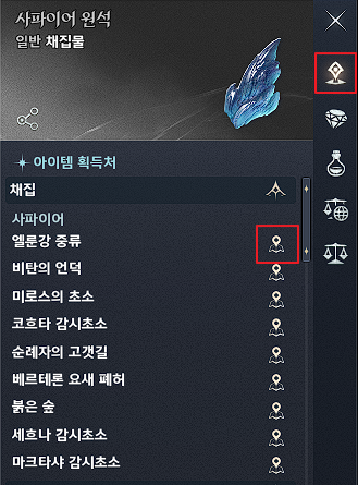 채집물 클릭 후 우측 상단 획득처 아이콘을 클릭하면 아이템 획득처를 지역별로 볼 수 있습니다. 맵 표시를 누르면 근처 키벨리스크 위치를 확인할 수 있어요.