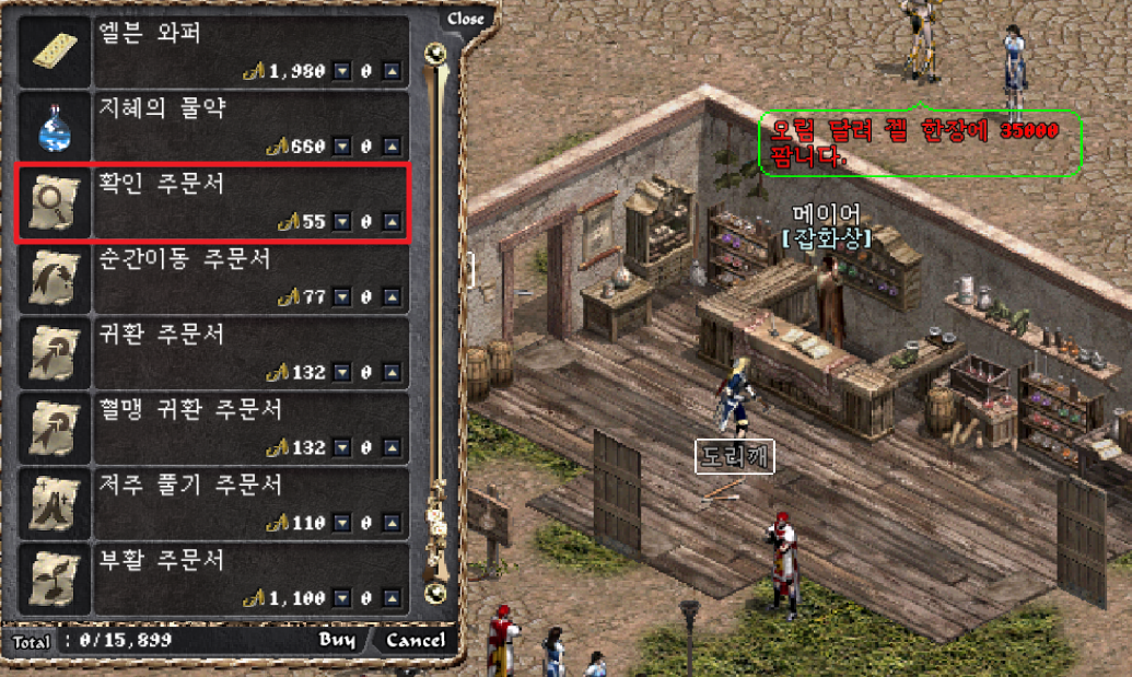 마을의 잡화상에게 구매할 수 있습니다. 확인 주문서 구매 후 더블클릭 후 해당 장비에 바르면 미확인 아이템의 정보와 강화 수치등을 볼 수 있습니다.