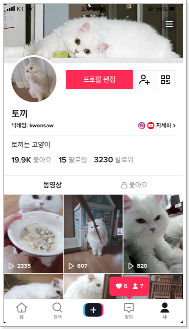 가입을 하고 그동안 찍어 놓았던 고양이 동영상을 올렸는데 이게 웬걸 조회수와 팔로워 숫자가 유튜브랑 비교도 안되게 올라가고 있어요. 현재 기준 3230명의 팔로워와 12,000 정도 좋아요가 있습니다. 사실 와이프나 저나 고양이가 너무 귀여워서 인스타와 유투브에 올리고 보고 있는데 다른 사람들이 와서 보고 귀엽다고 해주면 뿌듯합니다. 기분도 좋고요. 틱톡은 정말 생각 없이 몇 개 올리고 말았는데 이렇게 반응이 올 줄은 몰랐습니다. 다른 틱톡 하는 분들에 비하면 적은 수치일지 모르지만 기대 안 하고 올린 저로서는 굉장히 기분이 좋네요.