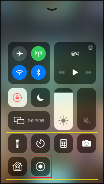 제어센터를 열어 하단에 보시면 하단에 화면 기록 버튼이 보입니다. 나중에 설명 드리지만 설정 > 제어센터에서 노란색 네모 안에 들어있는 메뉴들이 추가 삭제가 가능하고 위치도 변경할 수 있습니다. 화면 기록 버튼을 누르면 3초 카운팅이 시작되고 녹화가 됩니다. 3초 카운팅이 있기 때문에 게임 영상 녹화 3초 전에 누르는 게 좋습니다. 그리고 제어센터를 내리고 게임 영상으로 돌아와 줍니다.