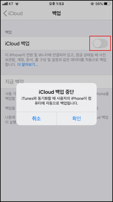 4. iCloud 백업을 끄고 확인 버튼을 누릅니다. 이제부터 아이폰이 아니라 동기화되어있는 컴퓨터로 백업을 한다는 소리 같습니다.
