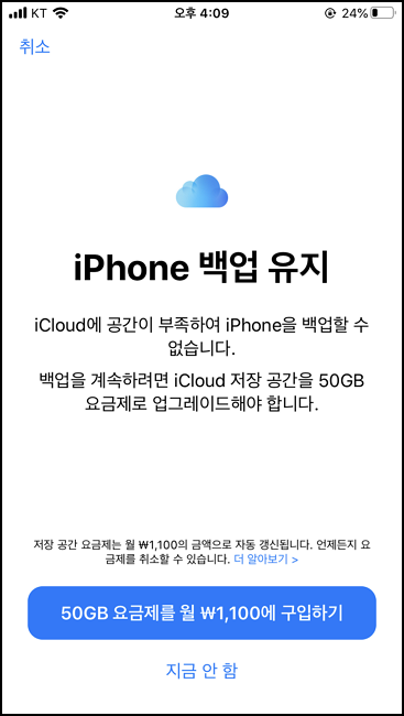 지금 안 함 버튼이 아니라 영원히 안 함 버튼이 있었으면 좋겠습니다. 요금제를 구입하면 백업 실패 메시지를 안 오게 할 수도 있겠네요.