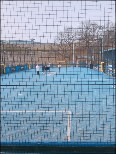 사진처럼 굉장히 세로로 길게 되어 있습니다. 바닥이 파란색이라 수영장 바닥처럼 보이지만 인조잔디입니다. 단점이 있다면 아웃사이드 공간이 없어서 아웃 상황에서 공을 차기가 불편할 수 있습니다. 풋살이라 큰 단점은 아닙니다만 참고하세요. 또 위에 펜스가 없기 때문에 자칫 밖으로 공이 나갈 수도 있습니다.