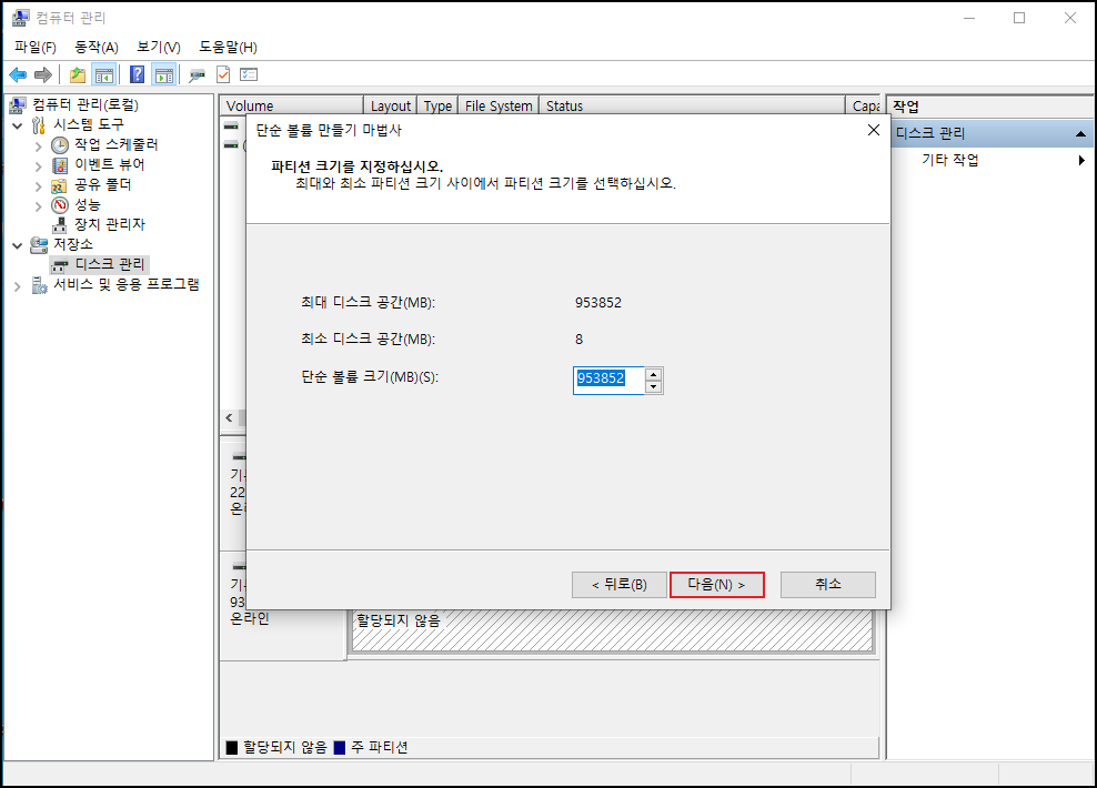 5. 파티션 크기를 지정하는 단계입니다. 단순 볼륨 크기는 기본 설정값으로 두고 다음을 누릅니다.