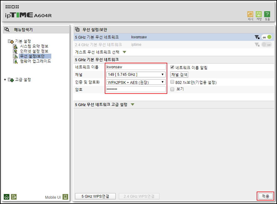 3. 기본 설정 > 무선 설정/보안 탭을 누르고, 이미지처럼 설정해 줍니다. 네트워크 이름과 암호를 설정해 줍니다. 채널은 자동으로 잡히는 것을 사용하면 되고 인증 및 암호화는 WPA2PSK + AES(권장)로 잡아주고 적용 버튼을 누르면 됩니다.
