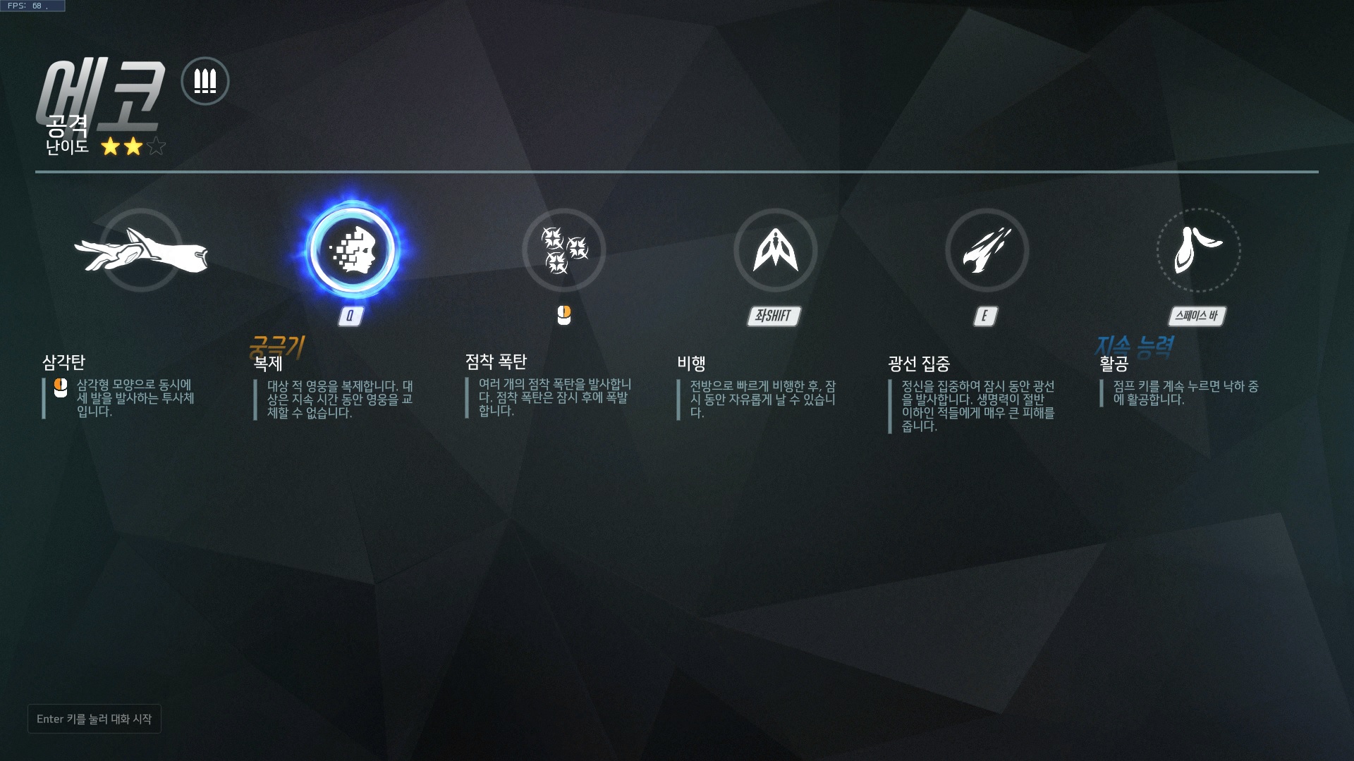 스킬 정보입니다. 기본공격인 좌클릭의 삼각과 우클릭의 점착 폭탄, E키의 광선 집중이 주요 공격 스킬이네요.