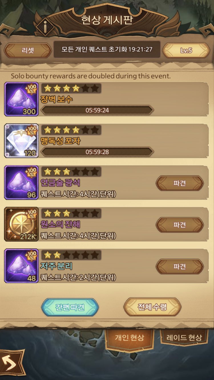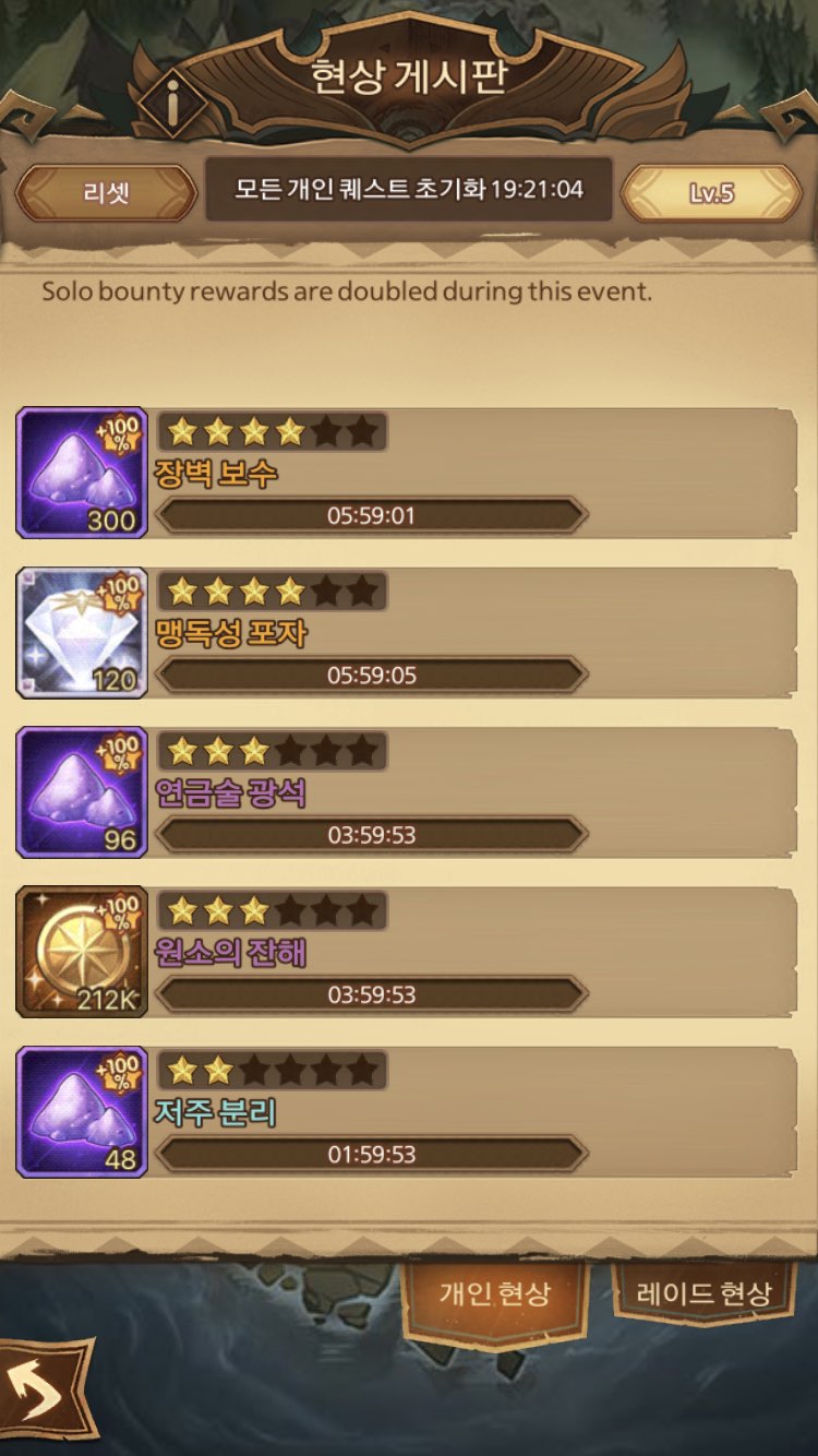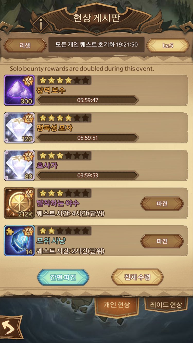 afk 아레나 현상게시판 리셋하는 방법에 대해 알려드립니다. 지금 5월 11일 기준으로 현상게시판 2배 이벤트를 하고 있습니다. 그래서 가루 수급을 원하시는 분들은 지금 무조건 현상게시판 리셋을 하고 있는데요. 저 또한 안 하고 있다가 지금은 리셋으로 가루와 다이아를 수급하고 있습니다. 리셋이란 개념을 모르시는 분은 현상게시판의 퀘스트를 모두 완료하고 다시 리셋을 하면 퀘스트가 다시 생성이 되는 걸로 아시는데 그렇지 않습니다.