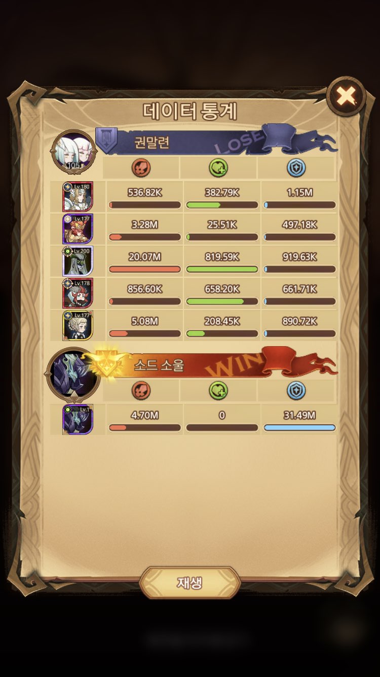 소드 소울은 약 3천만 정도 딜량이 나오고 있습니다. 리즈보다는 조금 까다로운 스킬이 많기 때문에 세미라, 루시우스, 손오공, 로완, 로젤린을 쓰고 있습니다. 광역 대미지가 강하기 때문에 루시우스 궁으로 보호막을 잘 쳐줘야 합니다. 그리고 마음의 전율이라는 스킬을 쓰는데 이것을 방어하기 위해 소환 스킬을 갖고 있는 영웅을 필수로 넣어줘야 합니다. 저는 손오공을 넣었지만 레벨과 진급 상태에 따라 바든 또는 그레쥴을 넣기도 합니다. 소환 스킬을 갖고 있는 영웅이 있다면 한 번씩 넣어서 시도해 보고 최적의 딜을 뽑은 조합을 찾아야 합니다.