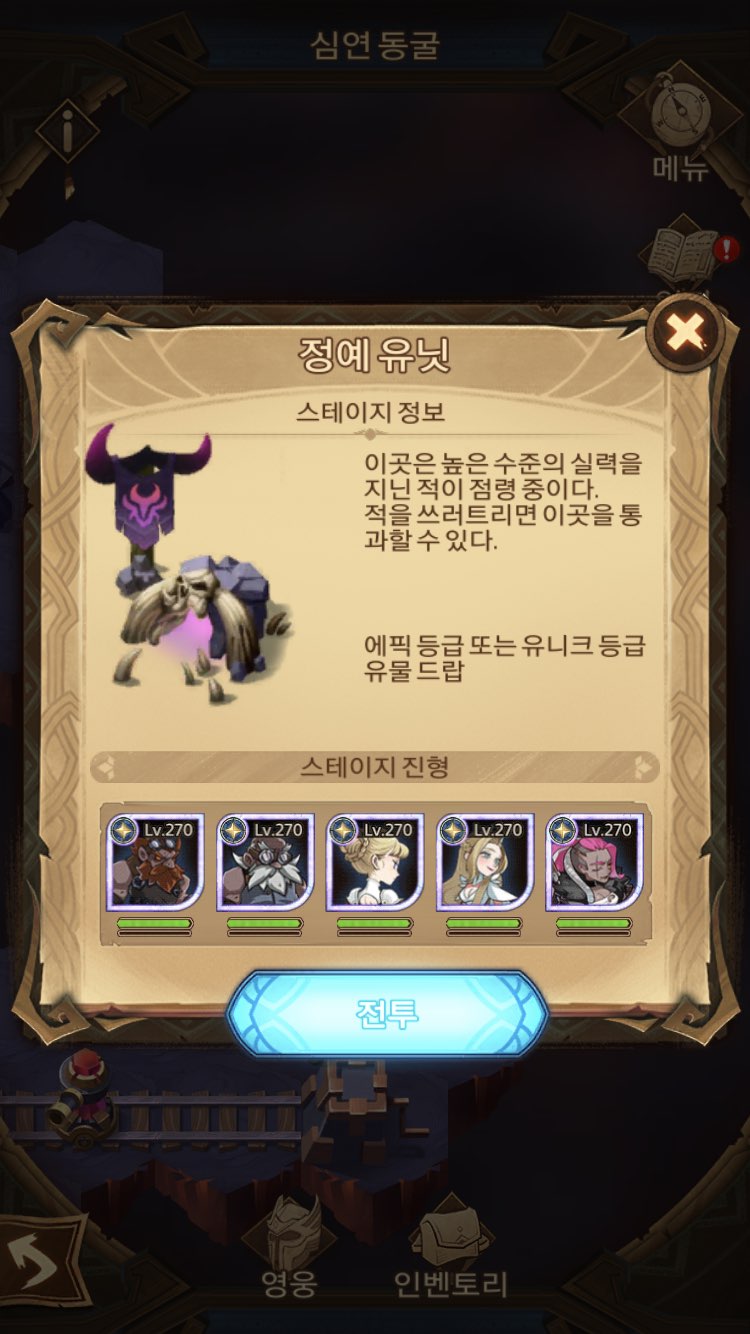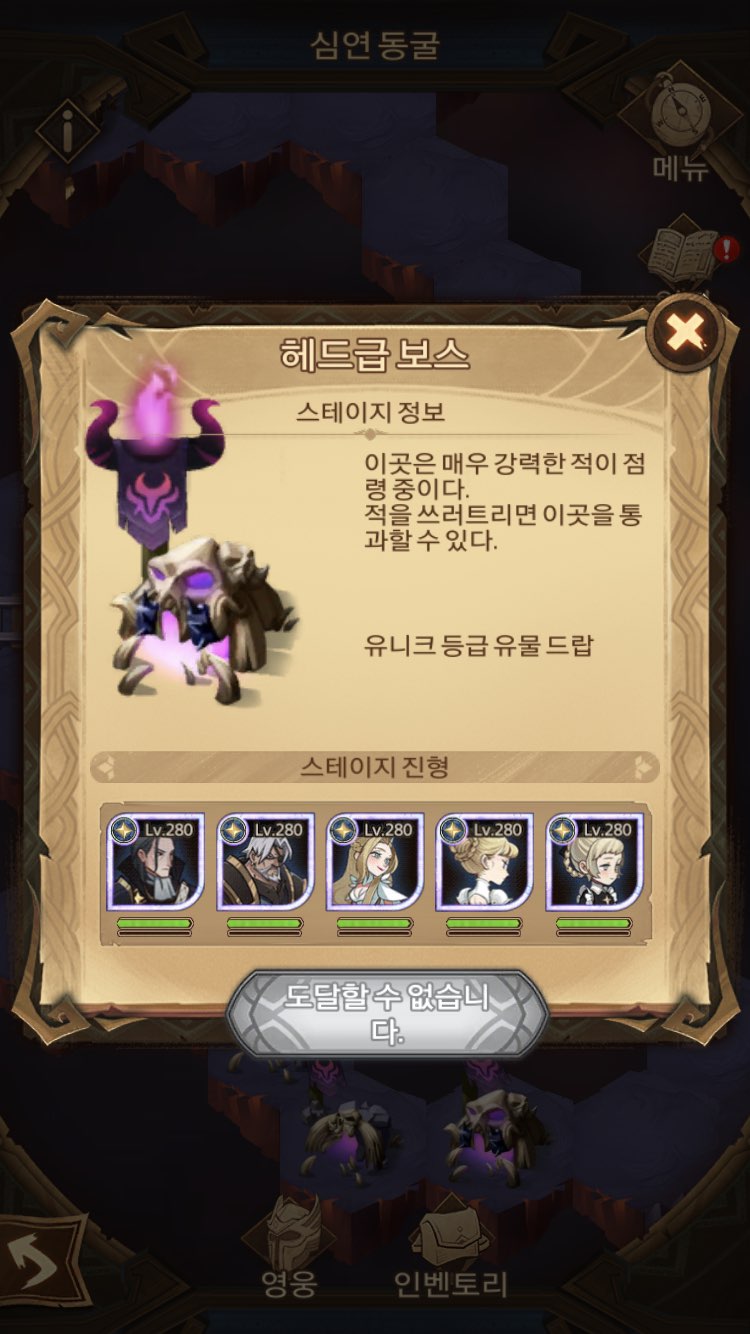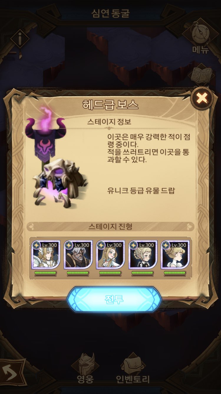 심연 동굴 헤드급 보스는 모두 다 레오프론입니다. 그래서 세미라가 상성에 가장 유리하기 때문에 더욱 쉽습니다. 이미지에 보이지는 않지만 레어 유물로 상성 대미지 40% 효과 유물까지 먹어서 더 유리했습니다. 세미라가 있다면 공격력 위주로 드시는 걸 추천합니다.