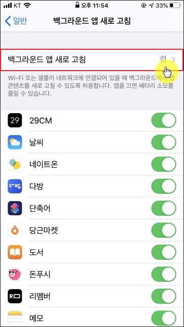 3. 상단에 백그라운드 앱 새로 고침을 클릭합니다. 기본적으로 켬 상태로 되어 있을겁니다. 만약에 백그라운드 앱 새로 고침을 원하는 앱이 있다면 아래 보이는 앱에서 하나하나씩 켜거나 해제할 수 있습니다.