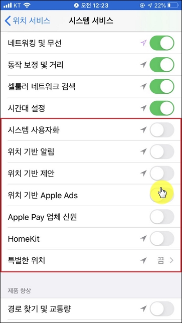 4. 앱이 아닌 아이폰 내 시스템에 관련된 위치 서비스 기능을 해제할 수 있습니다. 저의 경우 시간대 설정 밑으로는 전부 해제했습니다. 시간대 설정 같은 경우는 해외에 나갈 일이 많지 않으면 꺼두셔도 됩니다. 해외에 가면 자동으로 해당 국가 시간대가 설정되기 때문에 유용하다고 생각해서 해제하지 않았습니다.