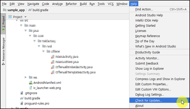 1. 안드로이드 스튜디오 메뉴 Help > Check for Updates... 를 클릭합니다.